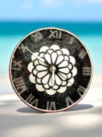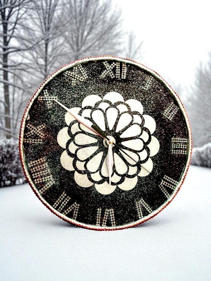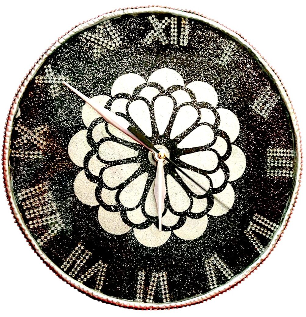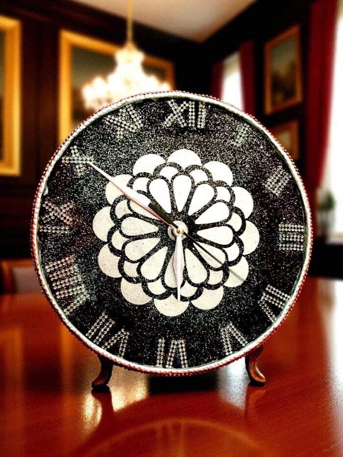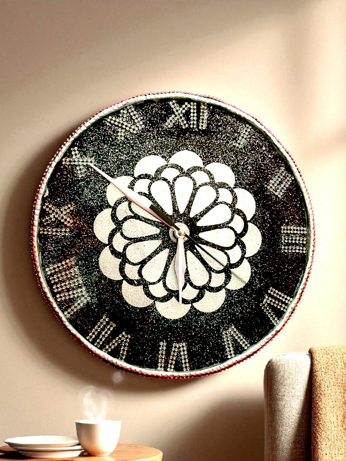 Artistic Design & Craftsmanship Kolam-Inspired Mandala Pattern: The heart of this clock features a sacred geometric floral motif, symbolizing balance, unity, and positive energy. Luxury Black & White Contrast: The bold jet-black resin base paired with shimmering white mandala details creates a striking, high-end look. Crystal Studded Roman Numerals: Each numeral is designed with embedded shimmering stones, offering sparkle and a regal touch. Intricate Resin Detailing: Hand-poured resin with precision artistry ensures a smooth glossy finish that enhances the luxurious aesthetic.
