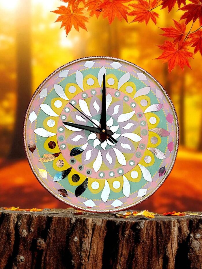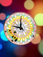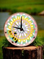 Clock Display Vibrant Color Wall Clock, Finish – Shiny, Shipping – Free, Shape: Round, Material: Wood And Resin, Weight: 750 gms, Hook – Prefixed on the back of the clock. Dimensions: 12 Inches Diameter Approx, Not Just A Clock But A Wall Art Décor.