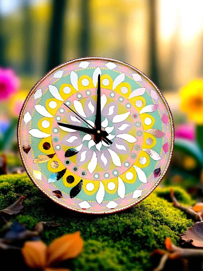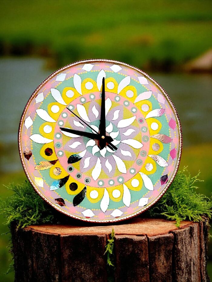 Bring home the charm of tradition blended with modern artistry with this Pastel Lippan Mandala Resin Wall Clock. Handcrafted with precision, this round resin clock features an intricate mandala design inspired by Lippan folk art, beautifully detailed with pastel shades of pink, mint green, yellow, lavender, and white.